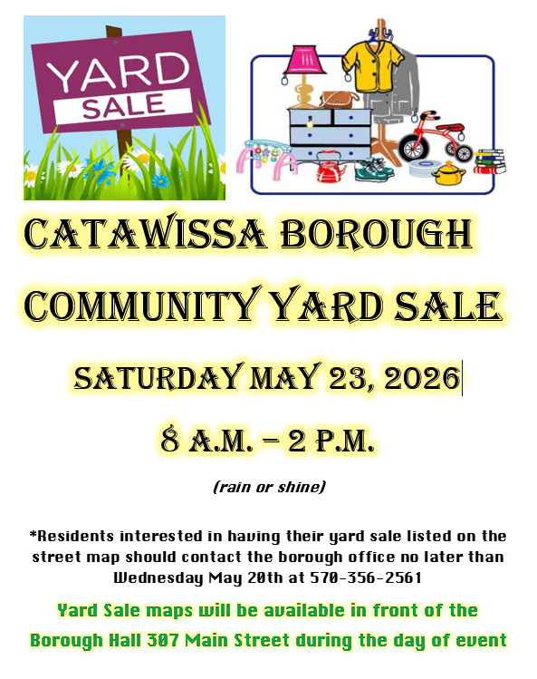 Catawissa Borough Community Yard Sale Image March 30, 2026 cataboro Share this: Email a link to a friend (Opens in new window) Email Print (Opens in new window) Print Like Loading...