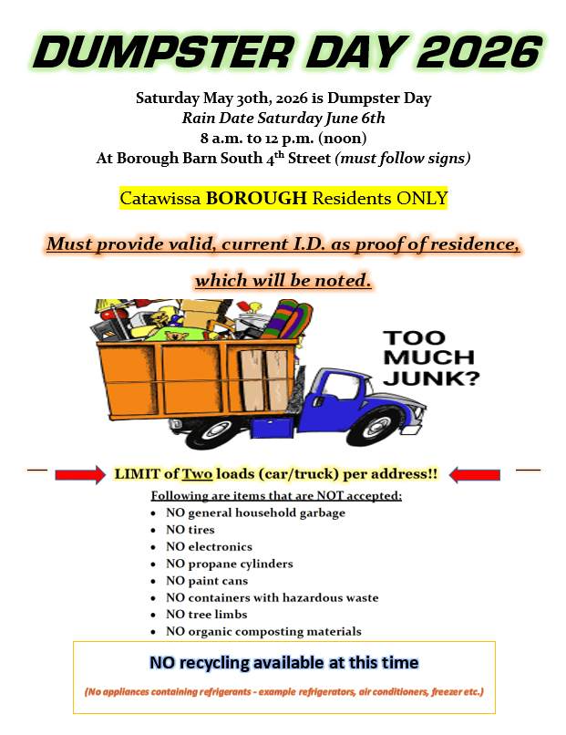 Dumpster Day May 30th Image April 15, 2026 cataboro Share this: Email a link to a friend (Opens in new window) Email Print (Opens in new window) Print Like Loading...